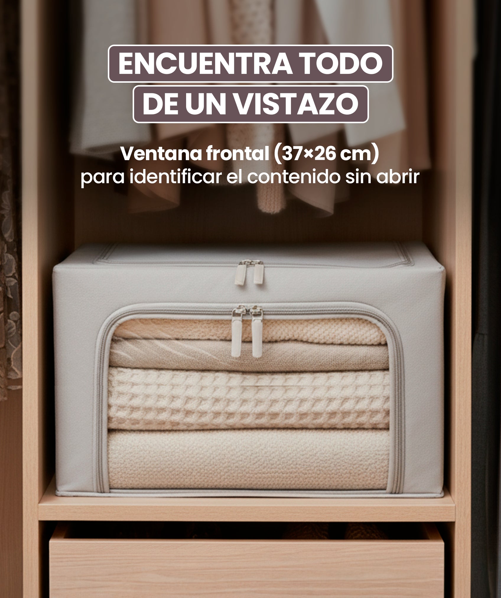 La cubierta cuenta con una ventana frontal de 25 x 15 cm o otra de 37 x 26 cm, que facilita la visualización del contenido, permitiéndote localizar en pocos segundos tus prendas u objetos.