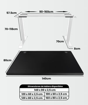 Mit unserem hochmodernen Schreibtisch können Sie die Abmessungen nach Ihren Wünschen anpassen. Verstellen Sie die Höhe von 70 cm auf 118 cm und die Breite von 90 cm auf 160 cm. Schaffen Sie den ergonomischen Arbeitsbereich, den Sie benötigen, unabhängig von Ihrem Bürostuhl!