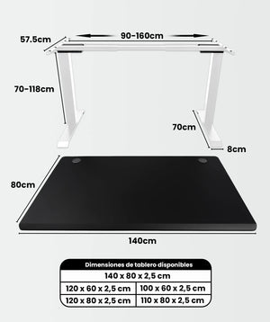 Der Schreibtisch aus legiertem Stahl ermöglicht eine Höhenverstellung von 72 cm bis 121 cm und eine Breitenverstellung von 90 cm bis 140 cm, was einen großzügigen und ergonomischen Raum für jeden Bürostuhl bietet. Außerdem ist die MDF-Platte in den folgenden Maßen erhältlich: