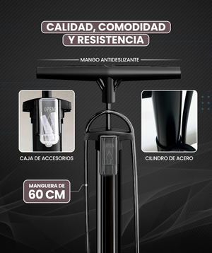 Mit einem ergonomischen Griff und einem Design, das vollständige Stabilität gewährleistet, war das Aufpumpen nie einfacher. Ob in der Garage oder auf dem Spielfeld, diese Pumpe ist dein zuverlässiger Begleiter.