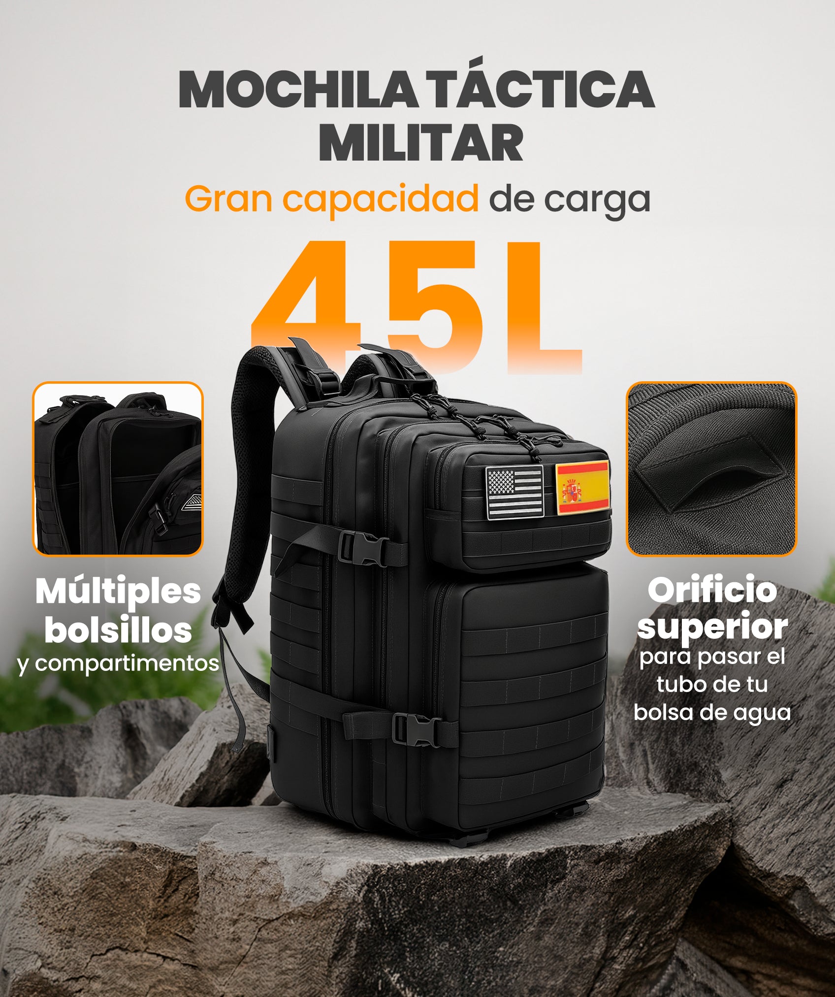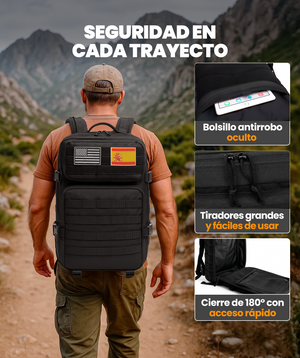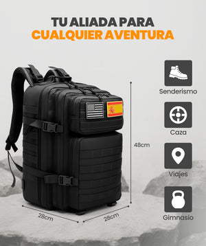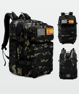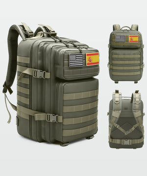 Mochila táctica de 45 L con sistema MOLLE, tejido Oxford 900D, apertura 180° y múltiples bolsillos. Resistente, ergonómica y versátil para viajes, senderismo, entrenamientos o uso diario. Ideal para llevar todo organizado y seguro.