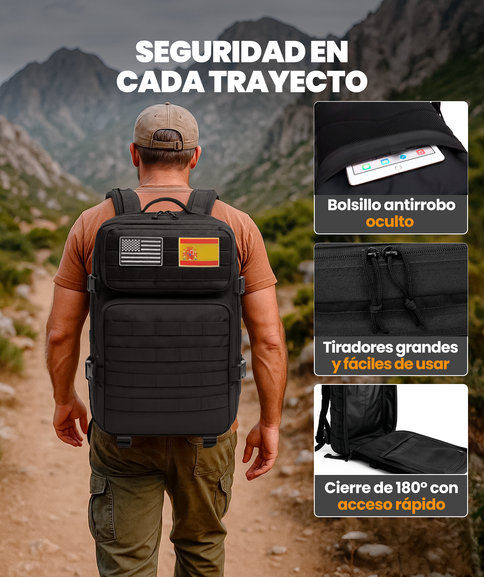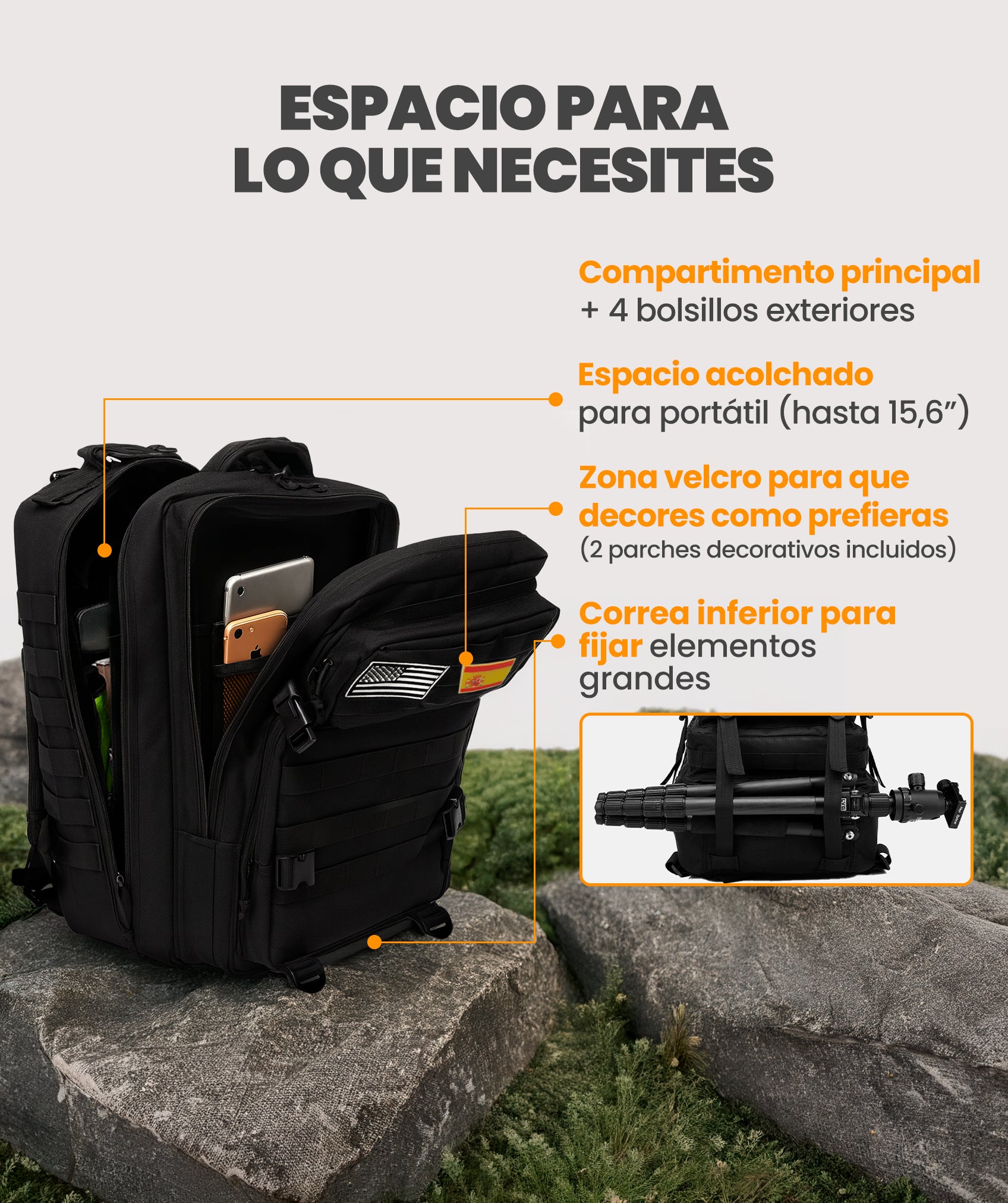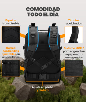El respaldo cuenta con tejido transpirable que evita la acumulación de calor y reduce la proliferación de microbios. Incorpora ajustes en pecho y cintura para mayor comodidad. Su estilo unisex la convierte en una opción versátil para senderismo, caza, acampadas, gimnasio, entrenamientos o uso urbano diario.