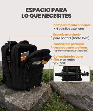 Equipada con correas en la parte frontal y los laterales, esta mochila permite acoplar bolsas adicionales, herramientas o material deportivo. Un diseño personalizable que se adapta a cualquier entorno operativo o recreativo.
