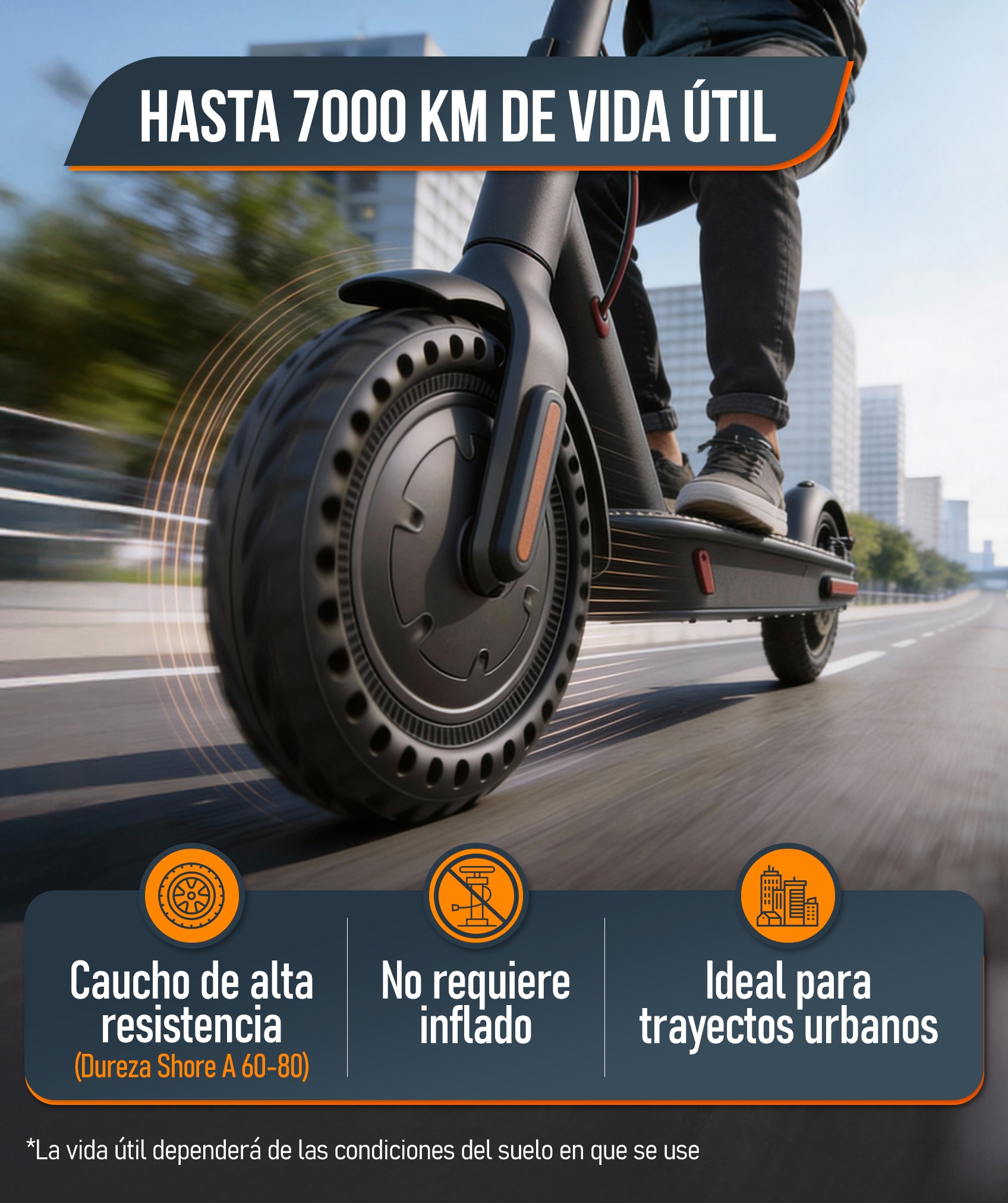 Fabricadas en caucho de alta resistencia con una dureza Shore A óptima (60–80), soportan hasta 7000 km de uso. Esto garantiza mayor confort y seguridad, sin riesgo de pinchazos.