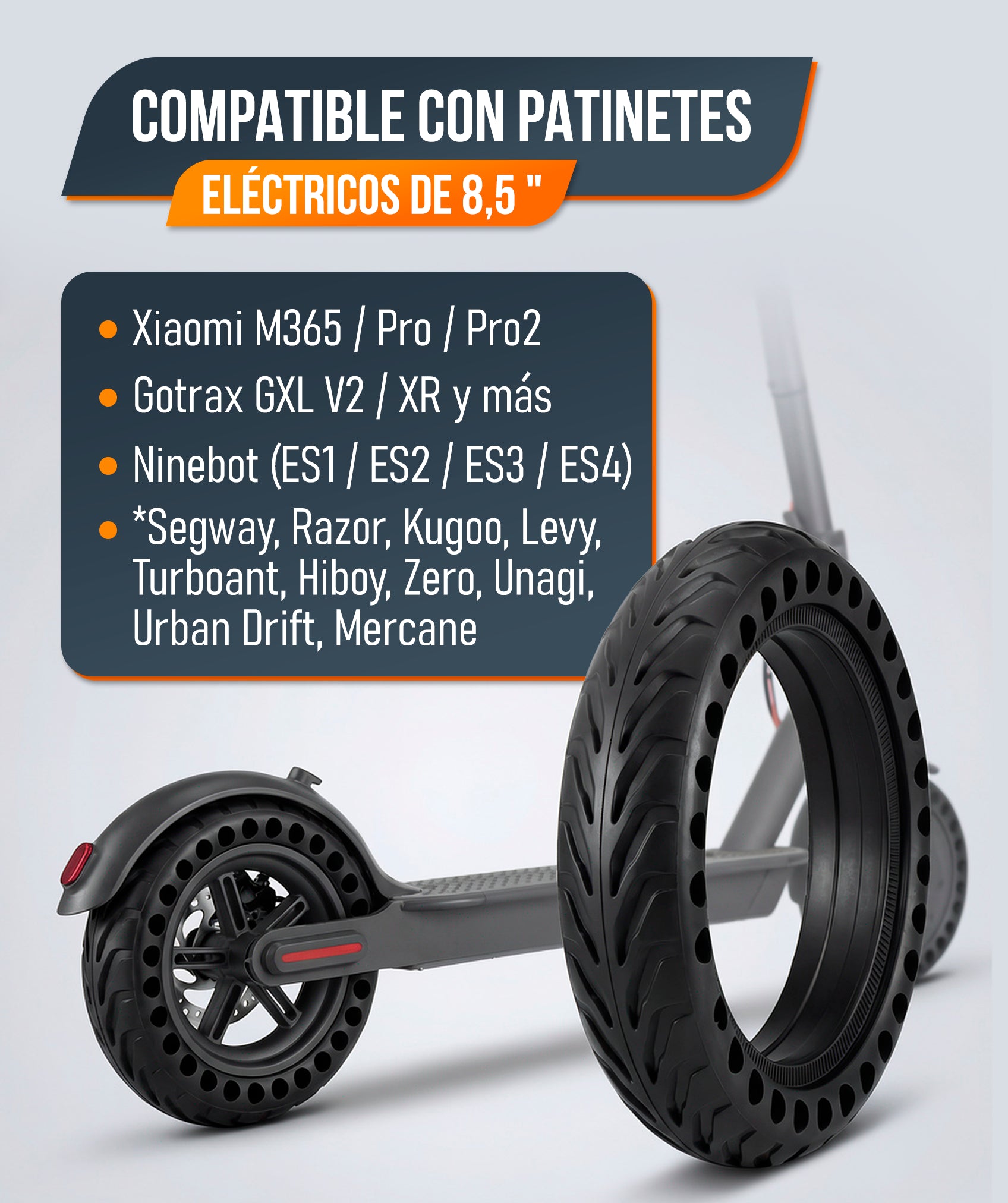 Diseñadas para patinetes eléctricos de 8,5'', como Xiaomi M365 / M365 Pro / Pro2, estas ruedas también se adaptan a otros modelos similares. Una solución versátil para renovar tu scooter.
