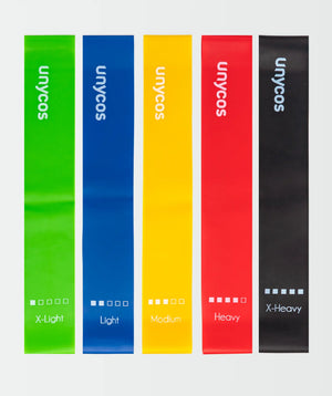 Set aus 5 Gummibändern aus Latex, hautfreundlich, um Allergien und ein Brenngefühl an Handgelenken oder Knöcheln beim Dehnen zu vermeiden. Sie bieten einen natürlichen, komfortablen und sicheren Griff, der das Ausführen vieler Übungen ohne Risiko von unangenehmen Rutschern erleichtert.