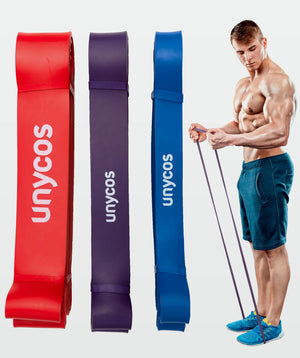 Set aus 3 Latex-Gummibändern, hautfreundlich, um Allergien und ein Brenngefühl an Handgelenken oder Knöcheln beim Dehnen zu vermeiden. Bietet einen natürlichen, bequemen und sicheren Griff, der das Ausführen zahlreicher Übungen ohne Risiko von schädlichen Rutschgefahren erleichtert.