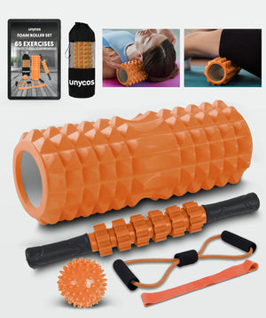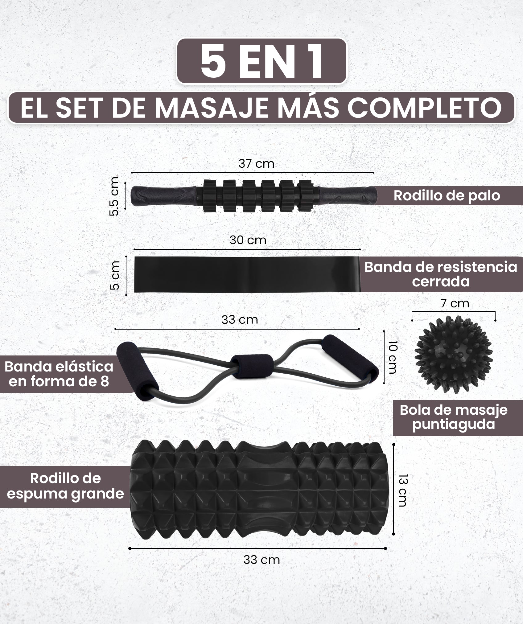 Trainingsset ausgestattet mit Schaumstoffrolle (33 x 13 cm), Fitness-Widerstandsband (30 x 5 cm), Massageball (7 cm), Rehabilitations-Massagestab (37 x 5,5 cm) und Formseil, ideal für verschiedene Zwecke, unabhängig davon, ob du ein Hochleistungssportler oder Anfänger bist.